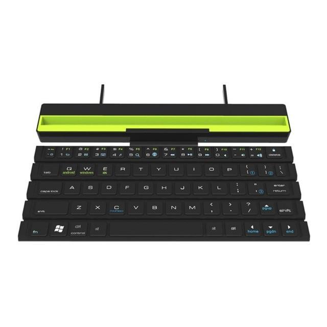 Our Rollable Keyboard allows you to type with your devices anywhere anytime! This super thin and compact Bluetooth keyboard saves room and makes it easy to take when you're traveling for business or have a meeting. This portable keyboard has a holder that is suitable for phones, tablets, and iPads.